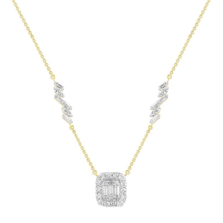 Gold and white gold hold diamonds safely. These metals resist damage and keep their shape. Diamond tennis and pendant necklaces use secure settings. Strong materials help protect the necklace during daily wear and movement. Located near the Hillsdale Mall, our jewelry store provides excellent selections of durable diamond necklaces.