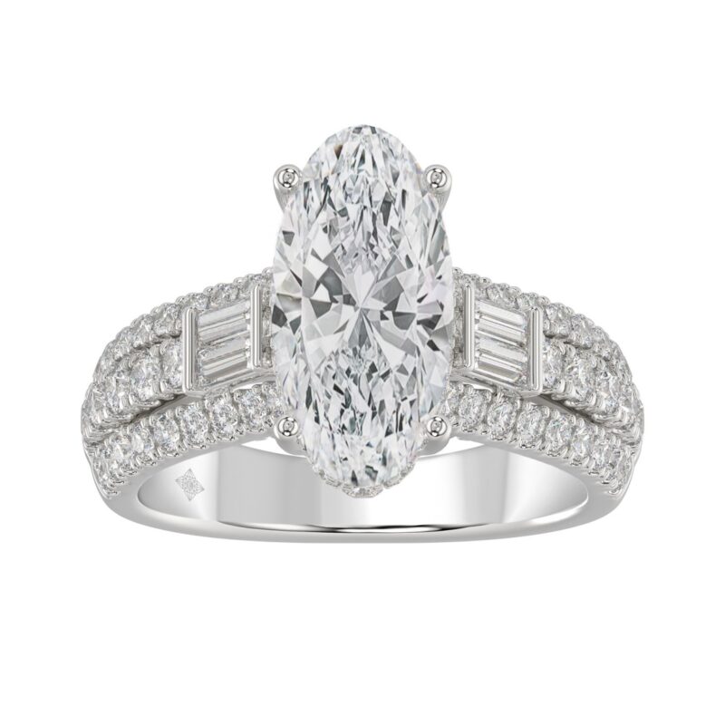 Ladies 14K White Gold ladies Ring Featuring Round Half-Moon & Baguette Diamonds 3.00CT Oval Center stone (Color F-G -Clarity VS1/VS2)