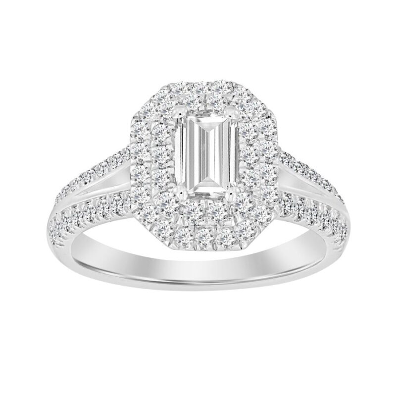 LADIES RING 1.30CT ROUND/BAGUETTE DIAMOND 14K WHITE GOLD (SI QUALITY) (CENTER STONE 0.75CT EMERALD DIAMOND)