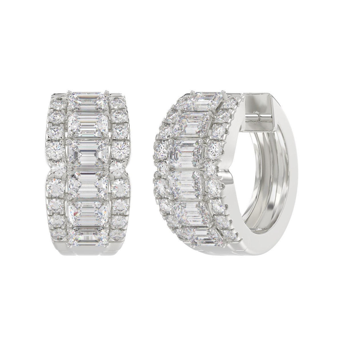 14K WHITE GOLD 1 3/4CT ROUND/EMERALD DIAMOND HOOP EARRINGS