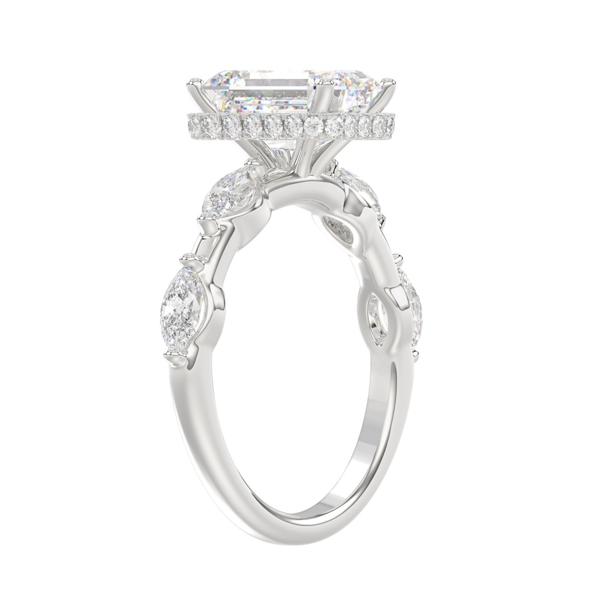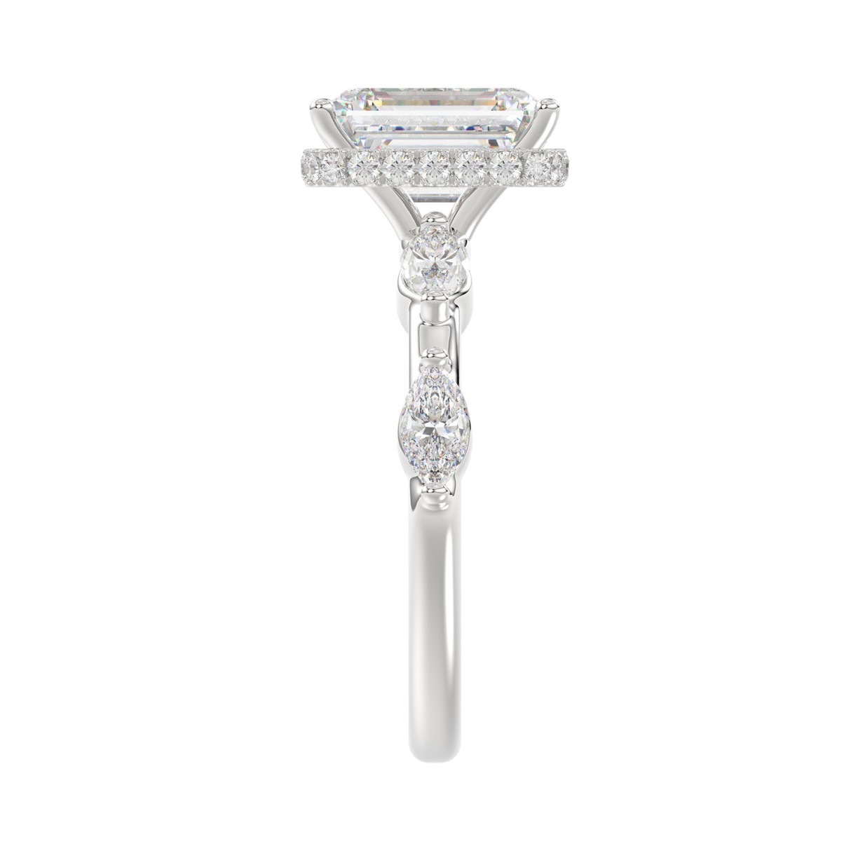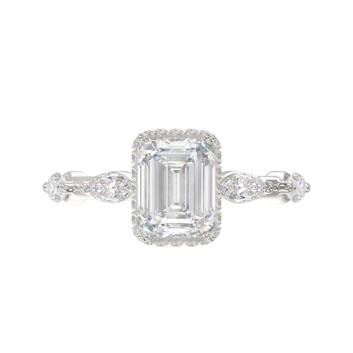 LADIES RING 3 1/2CT ROUND/MARQUISE/EMERALD DIAMOND 14K WHITE GOLD (CENTER STONE EMERALD DIAMOND 3.00CT)